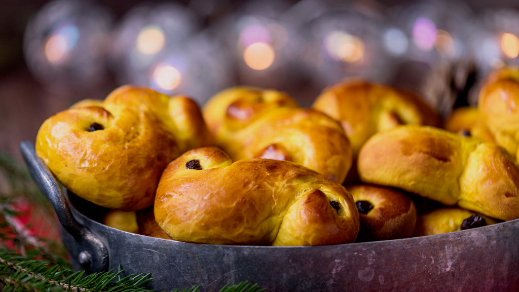 Lucia Buns are, as the name suggests, traditionally eaten at Lucia celebrations on 13 December. These fragrant saffron buns are delicious with a coffee, hot chocolate or Glögg, Swedish mulled wine.