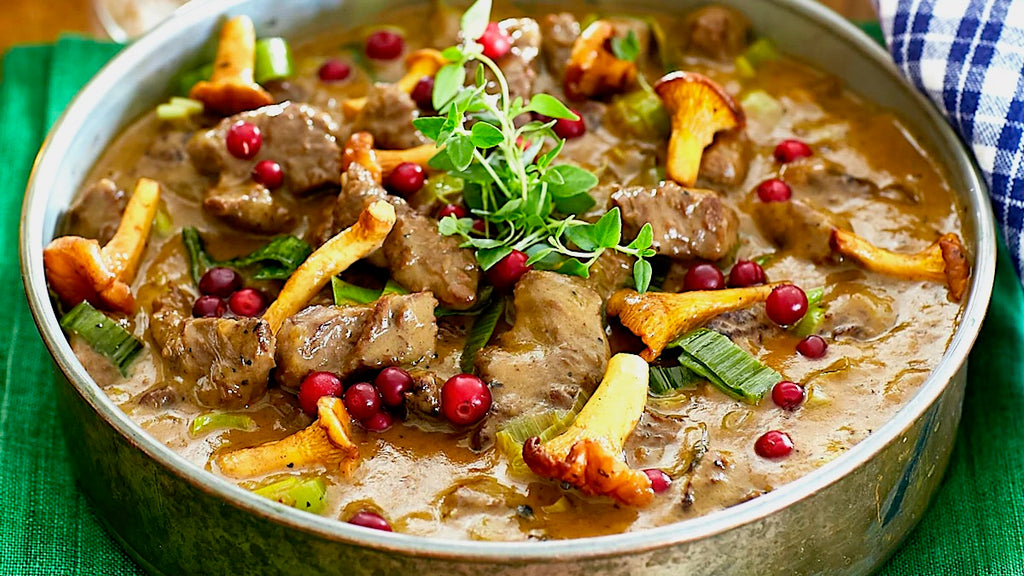 This hearty creamy pork strew with chanterelle mushrooms and lingonberries is full of flavour - perfect for a family meal or a dinner party.